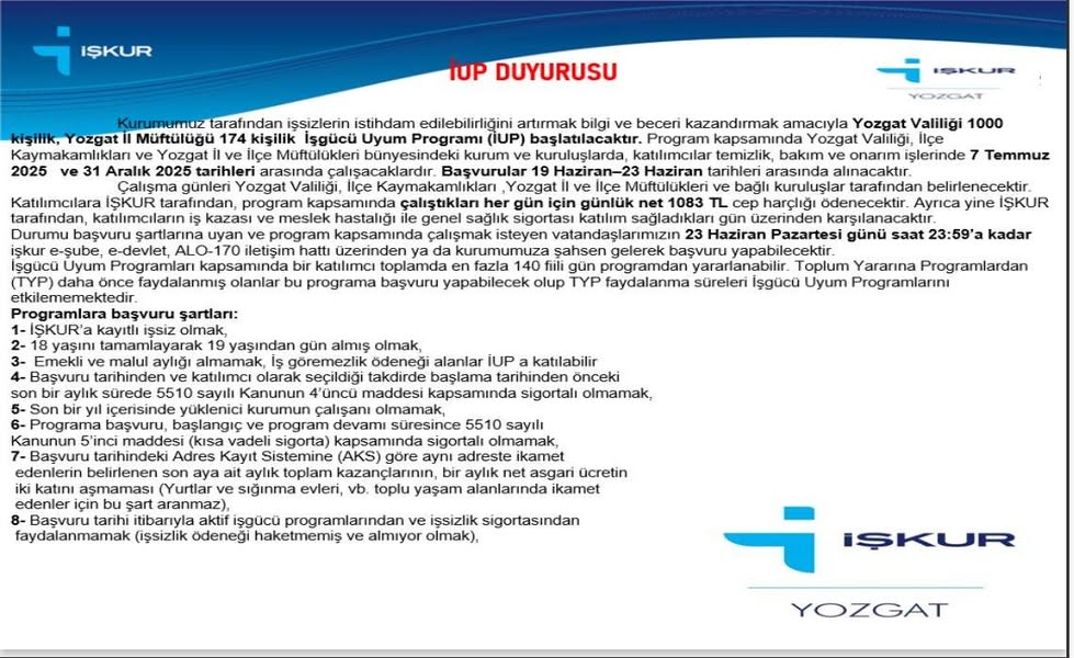 Yozgat Valiliği, Kaymakamlıklar ve İl/İlçe Müftülüklerinde çalıştırılmak üzere İş Gücü Uyum Programı (İUP) kapsamında İŞKUR İl Müdürlüğünce personel alımı yapılacağını duyurdu. Başvurular 19-23 Haziran 2025 tarihleri arasında alınacak.